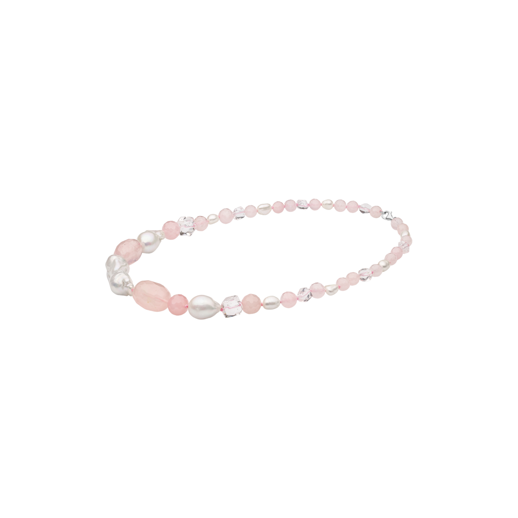 Kaulakoru ruusukvartsilla, helmillä, kristallilla ja hopealla