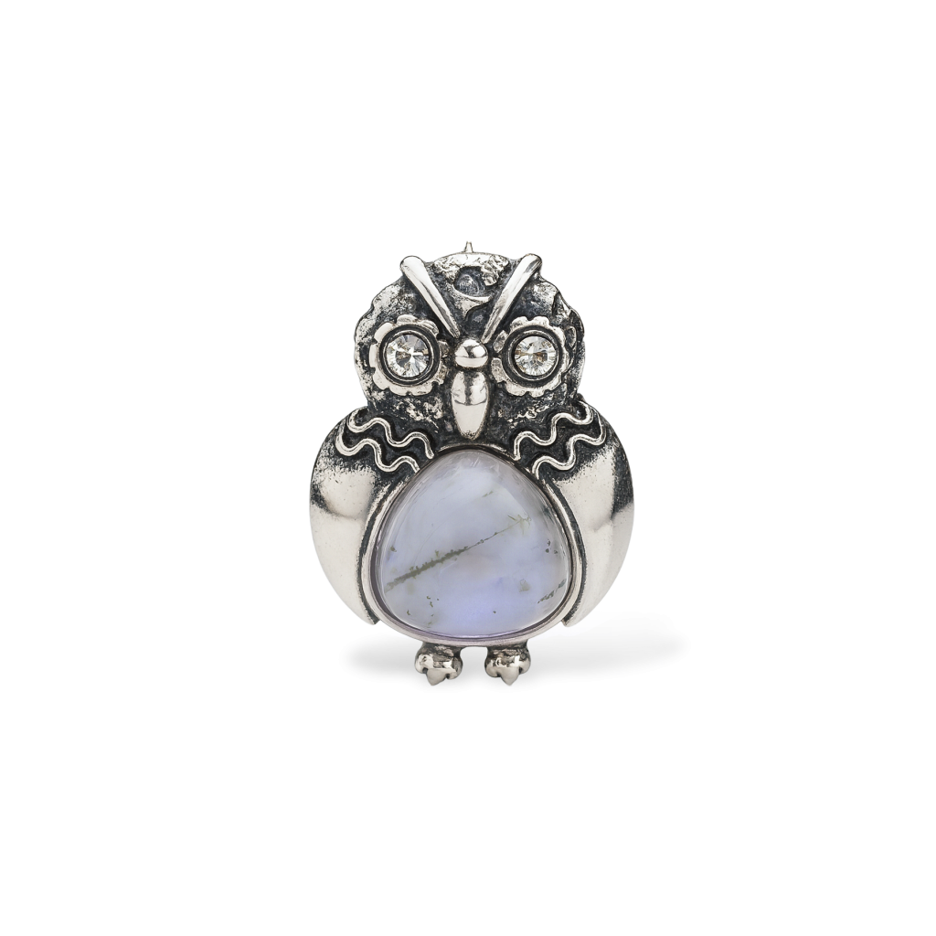 Hopeinen rintaneula akaatilla ja zirkoneilla "Pöllö"