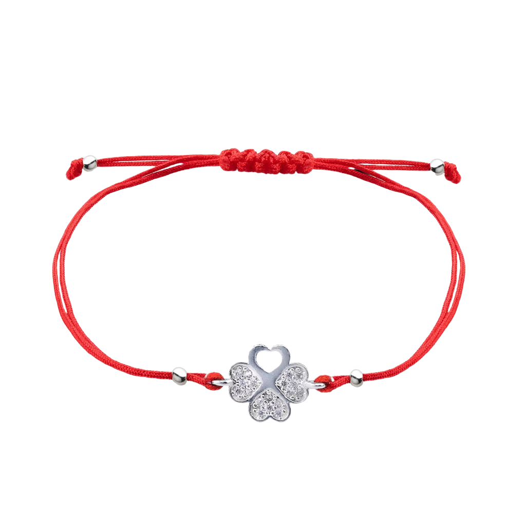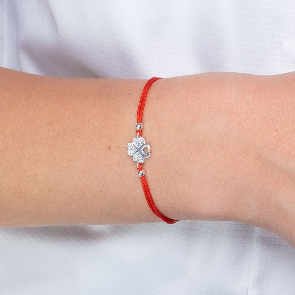 Punainen lanka rannekoru hopeisella riipuksella ja zirkoneilla "Apila"