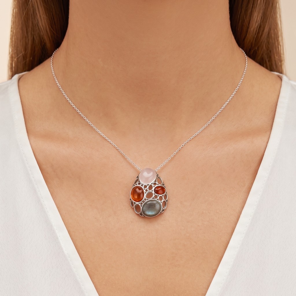 Hopeinen riipus meripihkalla ja labradoriitilla