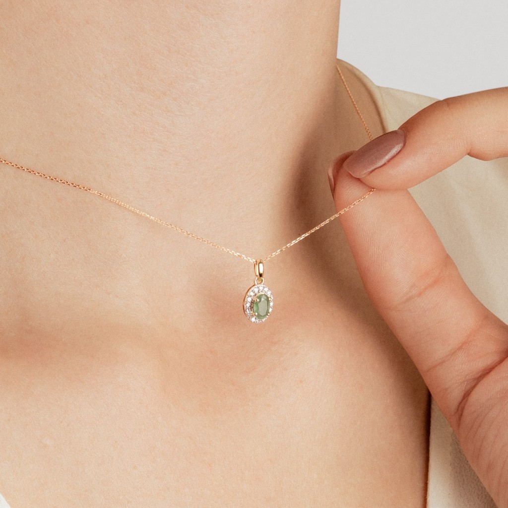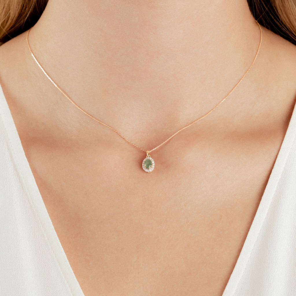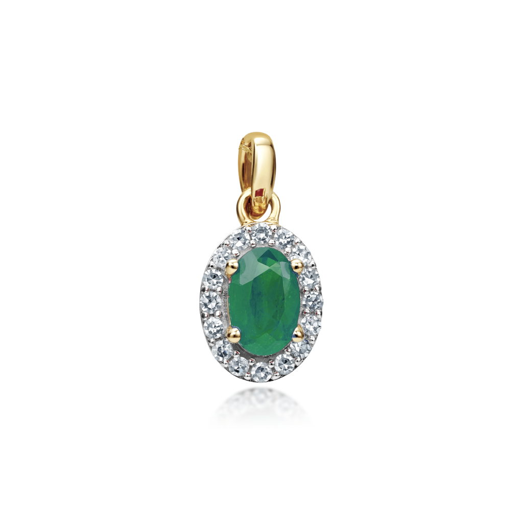 Keltakultainen riipus smaragdeilla ja timanteilla